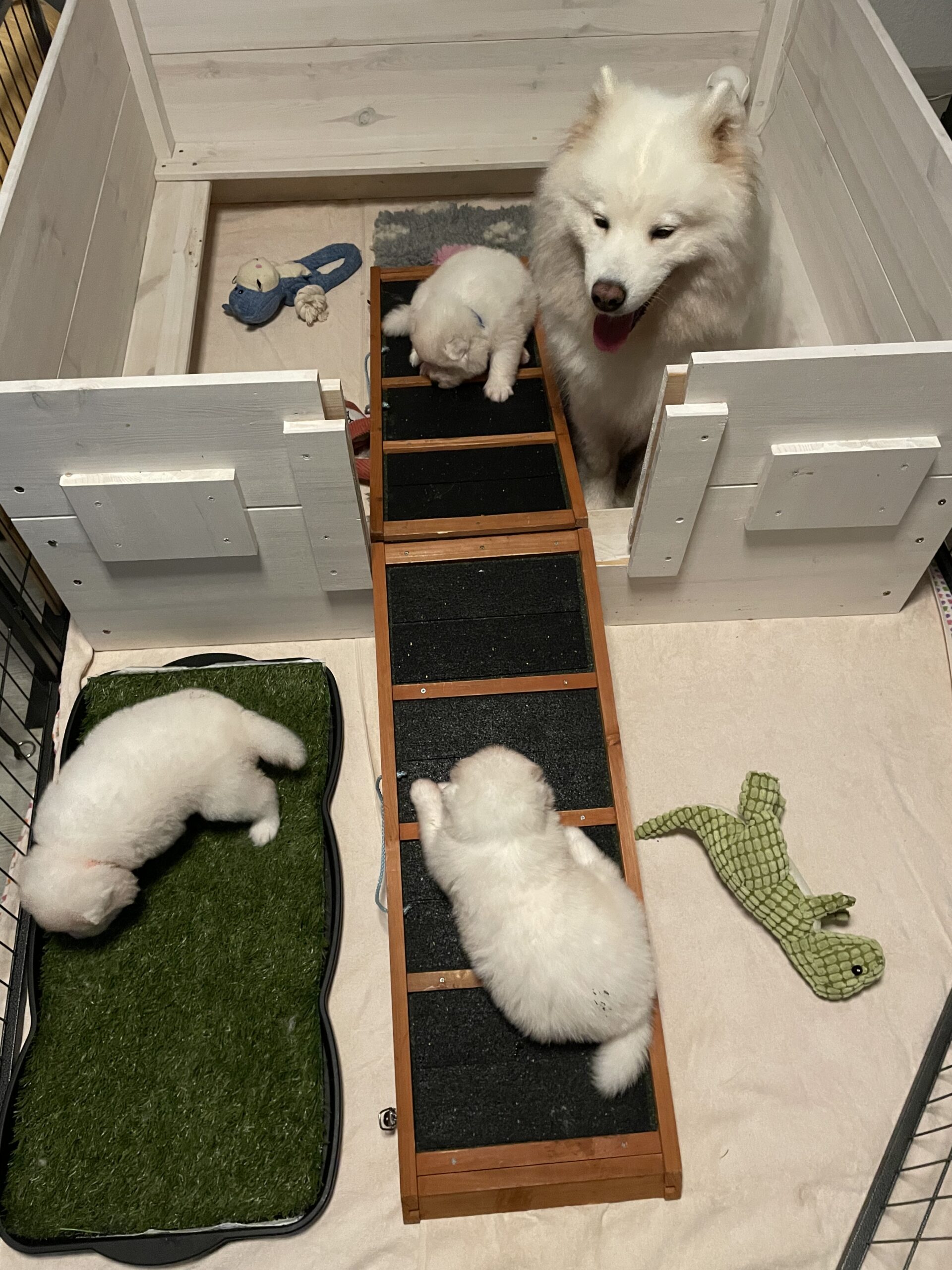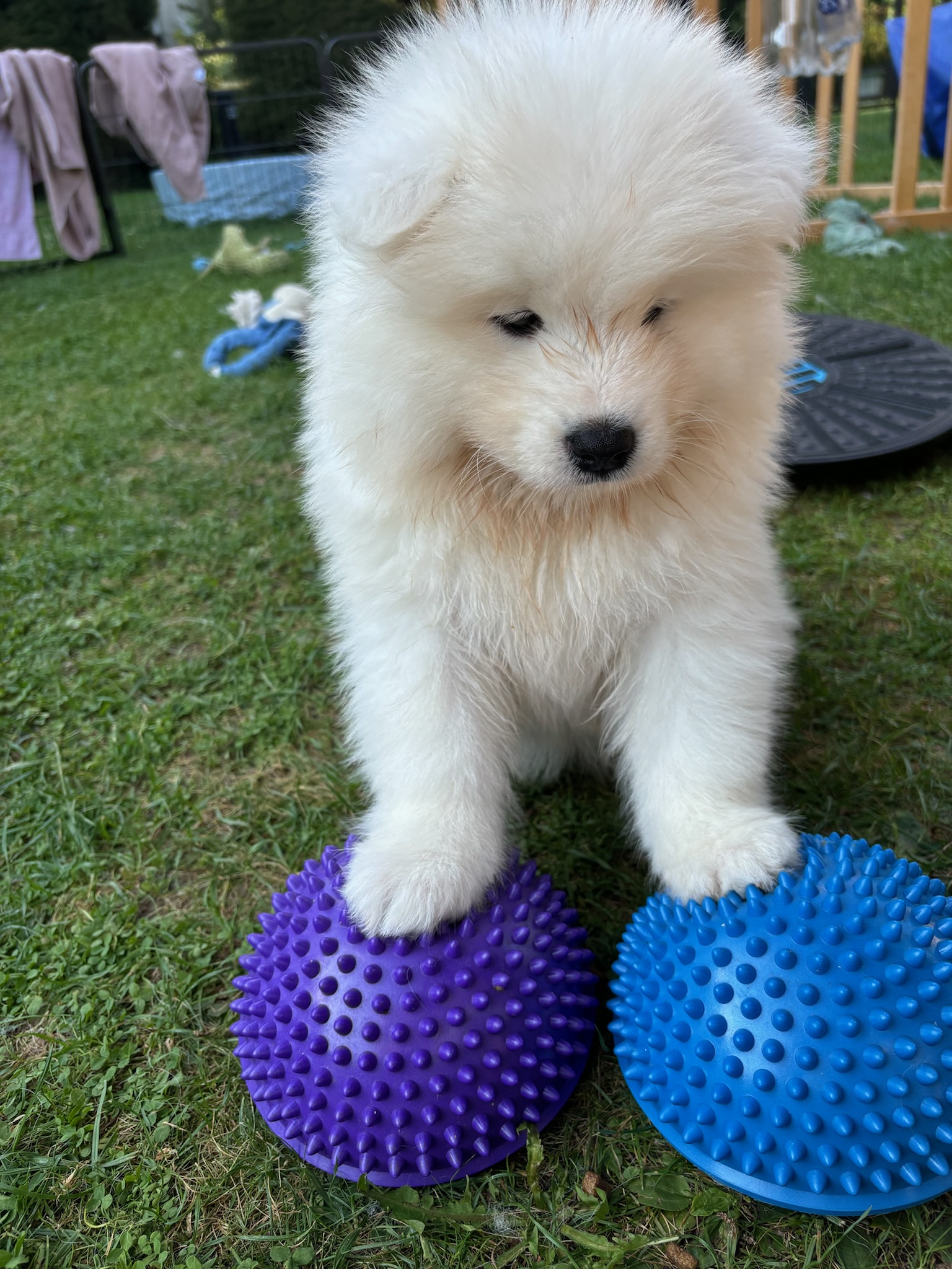 Sobald die Welpen laufen können (und teilweise auch schon vorher), dürfen sie unterschiedliche Untergründe erkunden. Verschiedene Materialien, Oberflächen und kleine Herausforderungen gehören von Anfang an dazu. Auch unterschiedliche Spielzeuge mit verschiedenen Geräuschen und Strukturen stehen ihnen zur Verfügung, damit sie neugierig bleiben und sich ausprobieren können.