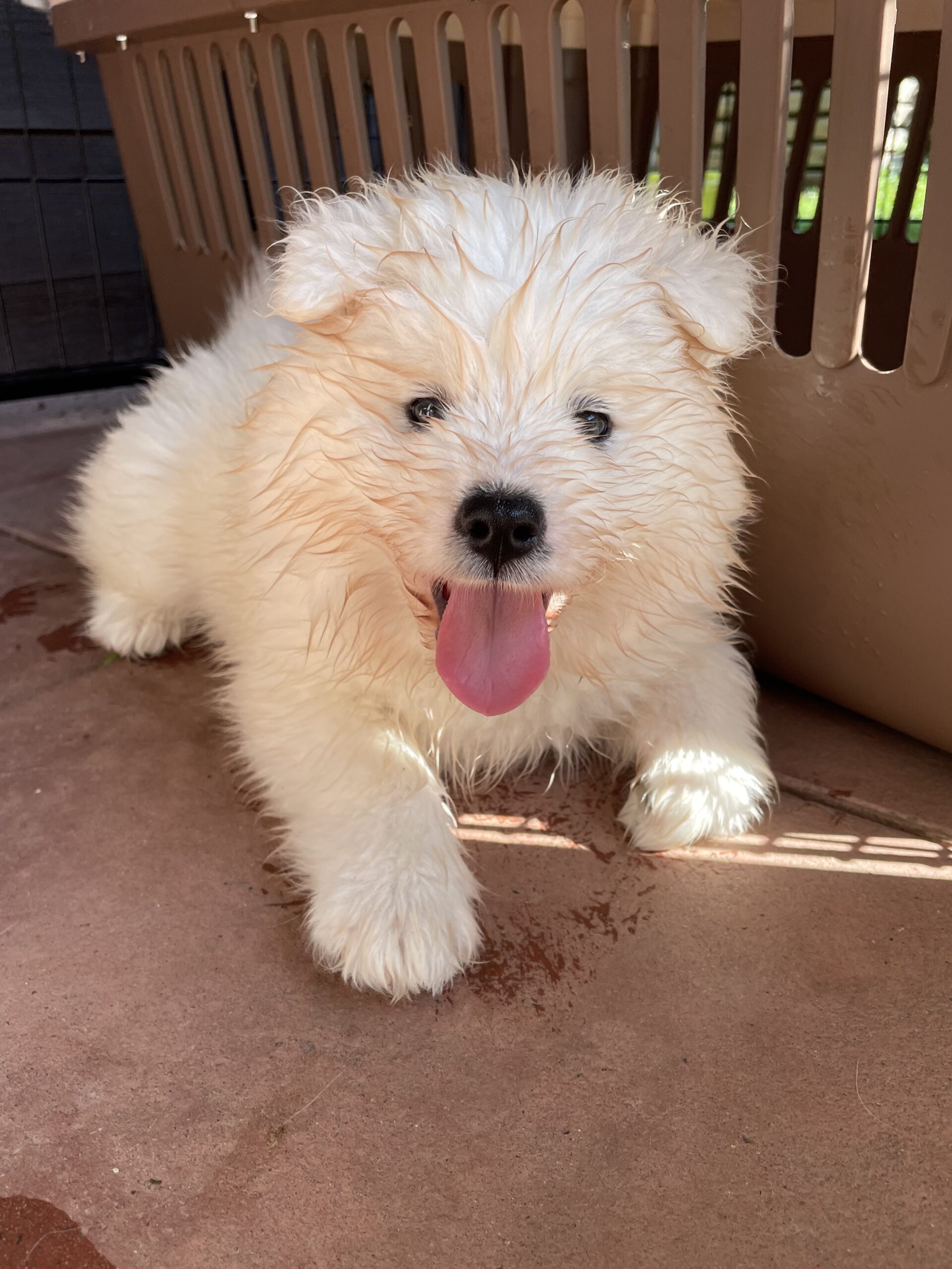 Mit etwa drei Wochen gehen die Welpen das erste Mal nach draußen und dürfen den Garten entdecken. Anfangs noch sehr begleitet und geschützt, später immer selbstständiger. Ab dem Alter sind sie zunehmend draußen und dürfen sich ihren Bereich nach und nach freischalten und ihre Umwelt erkunden. Wir passen den Auslauf an das Alter der Welpen an, je größer sie werden, desto mehr Platz zum Erkunden und Toben brauchen sie, dafür können sie fast 3000qm nutzen :P